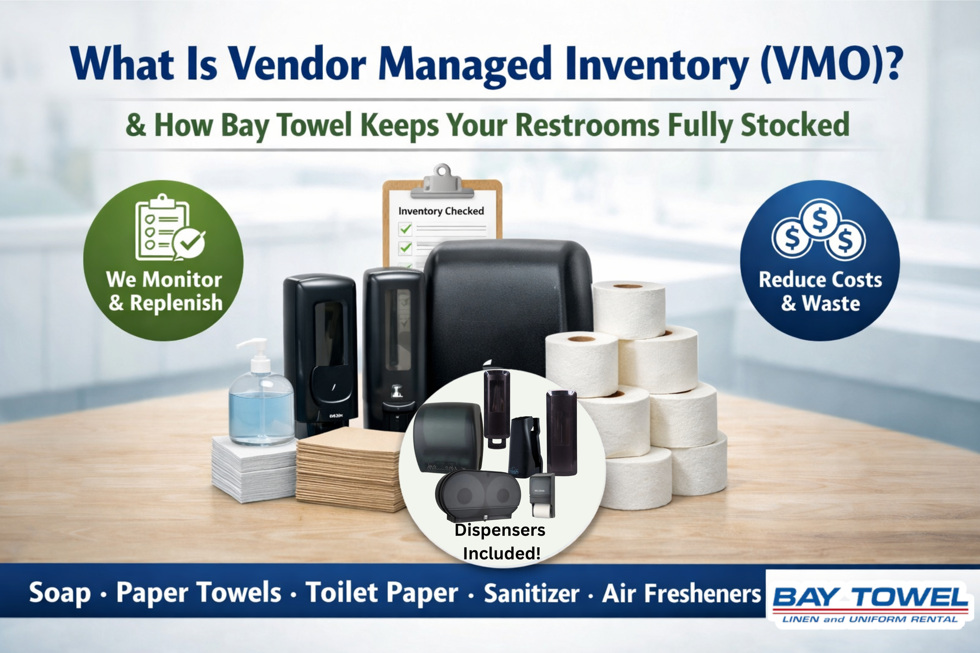 Managing restroom supplies may not be the most visible part of your operation — but it’s one of the most important. When soap runs out, paper towels are empty, or toilet paper isn’t available, people notice immediately. It affects employee satisfaction, customer perception, and even your company’s reputation. That’s where Vendor Managed Inventory (VMO) comes in. And at Bay Towel, we’ve built a VMO program designed to eliminate restroom supply stress completely.